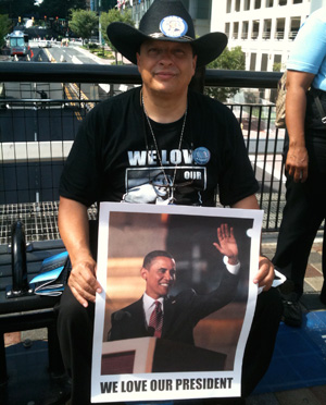 Sitting on the bench waiting for a light-rail train to take him back to his hotel was Gus Mansour, a DNC delegate from Lynnwood, Washington. He wore a ten-gallon Stetson to protect himself from the sizzling North Carolina sun. He was holding a poster with a photo of Obama. Written in bold letters, the poster proclaimed, “We love our President.”