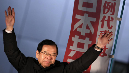 Photo: Kazuo Shii, head of the Japanese Communist Party, waves during the last day of campaigning for parliamentary elections in Tokyo, Dec. 13, 2014. | Eugene Hoshiko/AP