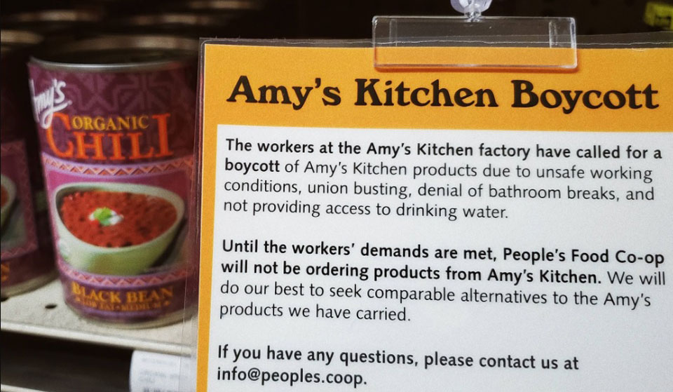 “Following complaints of poor working conditions, such as lack of bathroom breaks and penalties for taking sick days, management at Amy’s Kitchen Is now requiring workers to attend anti-union meetings. Two workers have been fired for supporting a union,” Local 19 said. “Workers should be able to fight for better conditions without fear.”