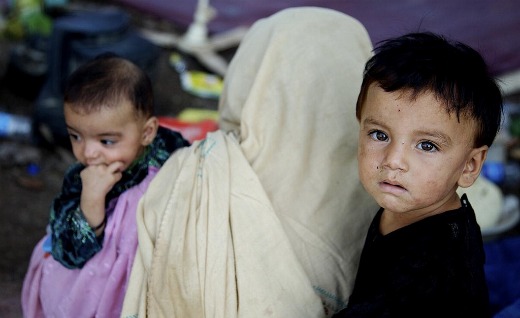 Photo: A woman and her two children stand in their makeshift shelter in the northwestern Khyber-Pakhtunkhwa province of Pakistan. Their home was destroyed in the floods that have affected an estimated 2.5 million of the province’s 3.5 million residents.