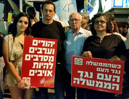 Photo: Knesset (Parliament) member Dov Khenin (second from left), a leader of the Israeli Communist Party, with other participants in a joint Jewish-Arab demonstration June 7 in Haifa, Israel, holds a sign reading “Jews and Arabs refuse to be enemies.” Communist Party of Israel/Al Ittihad