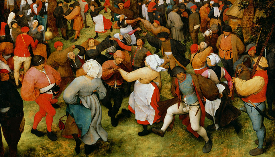 Bruegel celebrated the deep-seated traditions of Dutch culture, highlighting the threat by Catholic Spain’s King Philip II. Most famous of all are of course Bruegel’s depictions of peasant life, as for example The Wedding Dance. This very this-worldly picture would have been frowned upon by the Church, as it disapproved of dancing and any obvious sensuality and joy in life. At this picture’s center, we see the joined hands of bride and groom dancing in the open air. The bride is the only woman without a white scarf and the working women’s apron, her red hair is loose, she is wearing a black dress (white dresses only became fashionable in the 19th century). The entire village is invited and it is a joyous community occasion. The dynamic movement within the picture is stunning, expressing the peoples’ enormous energy, and one can easily imagine the bagpipe music. Aside from the dancing, there is sexual freedom among the villagers, too. The bagpipe itself is a sexual symbol, apart from it being a folk music instrument. The unrestrained enjoyment of life, the energy, the dancing, music, and sexual freedom are all a clear statement of resistance to the political and religious control of the Dutch people.