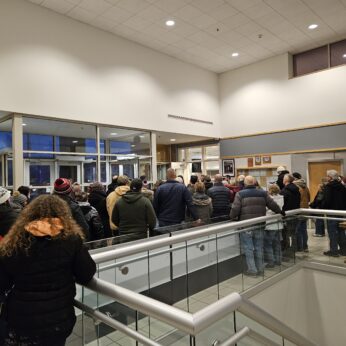 Residents who could not fit into the council room stand outside and listen on personal cell phones to the meeting.| Nicholis Hall/People’s World