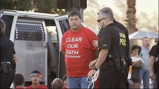 Photo: Tirso Moreno, of the Farmworker Association of Florida, being led away by the police. (via FWAF)