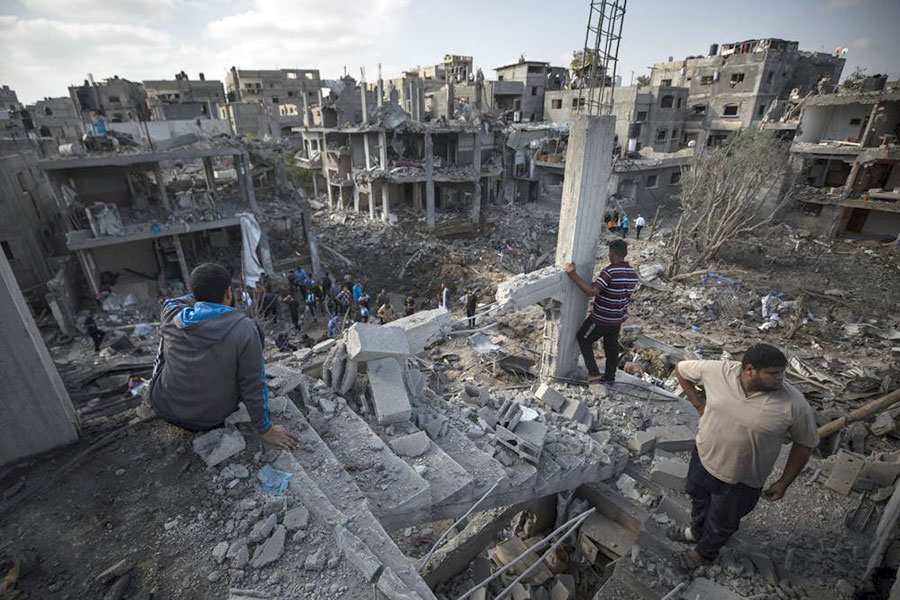 Palestinians inspect their destroyed houses following overnight Israeli airstrikes in the town of Beit Hanoun, northern Gaza Strip, Friday, May 14, 2021. | Khalil Hamra / AP