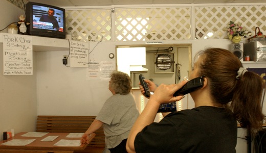 Photo: In Whitesville, W.Va., Libby Scott, left, and Reva Smith, a server at the City Diner, search for the correct station to watch a news conference about the mine explosion, April 7. Jon C. Hancock/AP