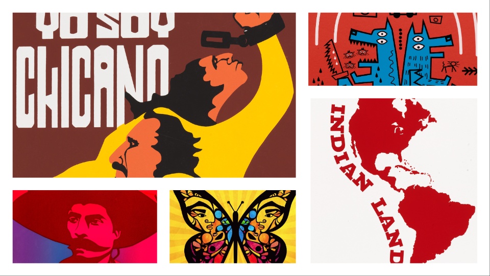 The exhibition relates in part to the Indigenous roots of Chicano people, which can be readily seen in graphics such as the posters “Who’s The Illegal Alien, Pilgrim,” by Yolanda Lopez; “Indian Land,” by Jesus Barraza; “Dignidad Rebelde,” by Nancypili Hernandez; “Cruising Turtle Island,” by Gilbert “Magu” Lujan; and “El Coyote,” by Michael Menchaca.