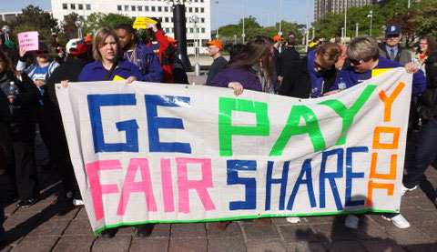 People expressed disgust at the fact that GE not only hasn’t paid taxes, but got a reimbursement from the federal government. Retired teacher Nancy Grady of Troy, Mich., said GE should pay their share so workers aren’t continually squeezed to try to balance the federal deficit.