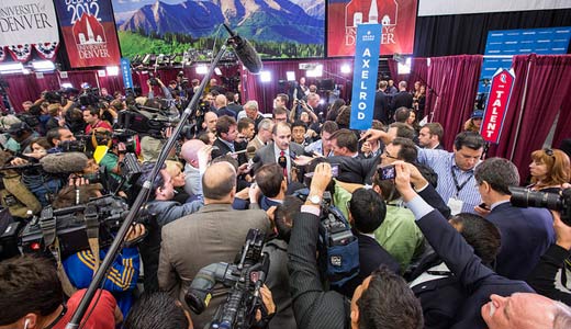 Photo: Reporters converge upon David Axelrod, a top political adviser for President Obama, at the Oct. 3 debate. University of Denver