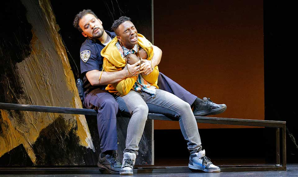 Many strong and lovely scenes dot Blue’s two acts, with a variety of musical styles to fit—where her girlfriends kid The Mother about her sexy new boyfriend and his size-16 shoes, and when they offer her their wishes; where she rhapsodizes about having waited for someone like him to love her; where The Father, at the maternity ward, holds a baby, his son, for the first time, and in that clinical setting calls his boy “a black exclamation point on white linen paper”; where Father and Son argue their viewpoints and share “the talk” about what a Black kid as an “endangered species” needs to remember out in public; the confrontation with the Reverend, where The Father has to admit his boy was shot by “one of my brothers in blue” and declares, “I ain’t gonna study war no more”; the moment the community recites all those cities where the uniformed “great white hunter” has declared open season on Black people; where the funeral assemblage wails and keens about a people “wounded, bruised, and brought low”; a family “festivity of food made with love…for my boys” that immediately precedes, like the Last Supper, the tragedy that will soon follow.