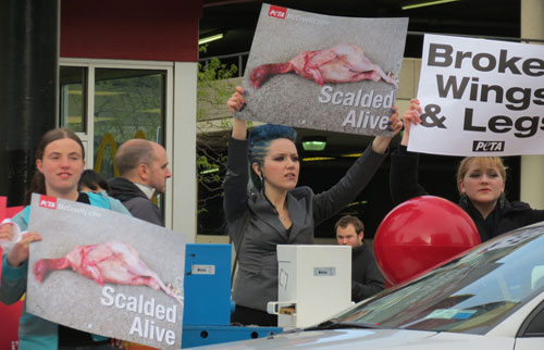 Photo: The Agonist’s Alissa White-Gluz, together with PETA, protests the torture of factory chickens. PETA