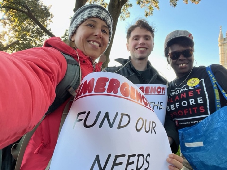Some signs read “Emergency – Scrap the Spending Cap,” “Fund Our Needs,” and “Tax the Rich.”