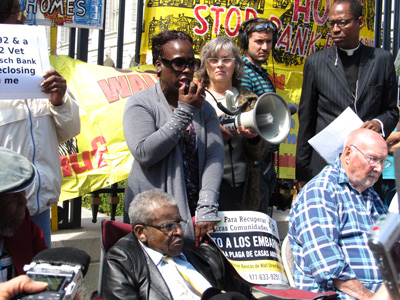 Standing behind her godfather, Alfred Richardson, Rita Hall told the crowd, “He is a retired veteran. For four years he has been trying everything he possibly can to get a loan modification on his home, and has never been successful.”