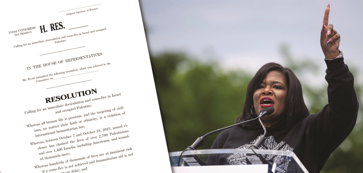“We salute Reps. Bush, [Andre] Carson, [Summer] Lee, [Delia] Ramirez, and [Rashida] Tlaib for standing up for peace,” by introducing the ceasefire resolution.