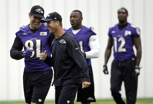 Photo: Baltimore Ravens tight end Owen Daniels, left, and head coach John Harbaugh laugh during an NFL football practice at the team’s headquarters, Monday, Sept. 8, 2014, in Owings Mills, Md. Ravens running back Ray Rice was let go by the Ravens on Monday and suspended indefinitely by the NFL after a video was released showing the running back striking his then-fiancée in February. (AP/Patrick Semansky)