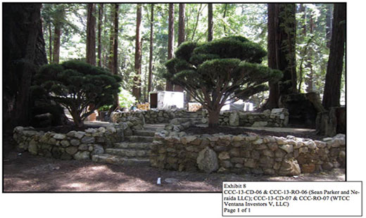Photo: A stone platform with a wall, staircase, and potted plants, all built in the middle of an otherwise pristine and ancient redwood forest. California Coastal Commission