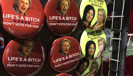 It’s a cheap reference to the Monica Lewinsky scandal that engulfed Bill Clinton’s White House in 1998. As the old saying goes, sex sells. Apparently the same can be said of sexism. As crass as the Monica button is though, that’s not the worst on display here. It’s actually just the beginning. “Trump that Bitch” and “Trump vs. the Tramp” are oft-heard chants. Flyers detailing Clinton’s supposed crimes are handed out with the headline, “Lock the bitch up!”
