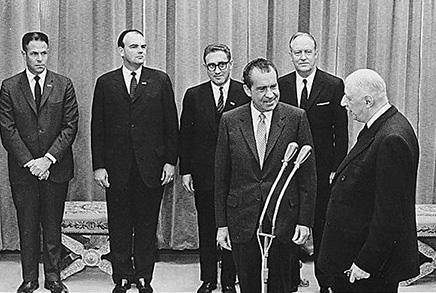 Photo: Nixon aides H.R. Haldeman and John Ehrlichman, National Security Adviser Henry Kissinger and Secretary of State William Rogers watch as President Richard Nixon talks with French President Charles DeGaulle, 1969. White House Photo Office Collection, National Archives, via wikimedia.