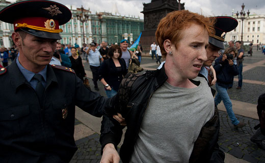 Photo: A gay activist is seized by police during a picket against homophobia on Russia Paratroopers Day, Aug. 2, 2013. Valya Egorshin CC 2.0
