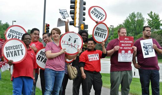 Hyatt fired housekeepers in its hotels in Boston and elsewhere, replacing them with out-of-state minimum-wage temps. Unite Here has called a boycott of Hyatt.