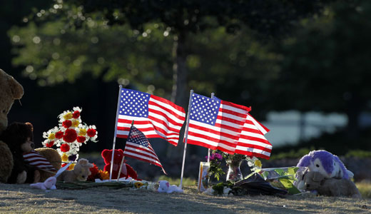Photo: Two flags are placed near a memorial by the Century 16 theater, where 12 were killed – and many more injured – during a vicious shooting by a young gunman. Alex Brandon/AP