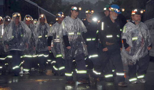 Photo: June 2010: Miners march to the candlelight vigil held outside Massey Energy headquarters the night before the Massey shareholder meeting. The vigil was held in remembrance of the 53 people killed on Massey property since 2000. As each name was read, a miner turned out his or her cap lamp. United Mine Workers Facebook page.