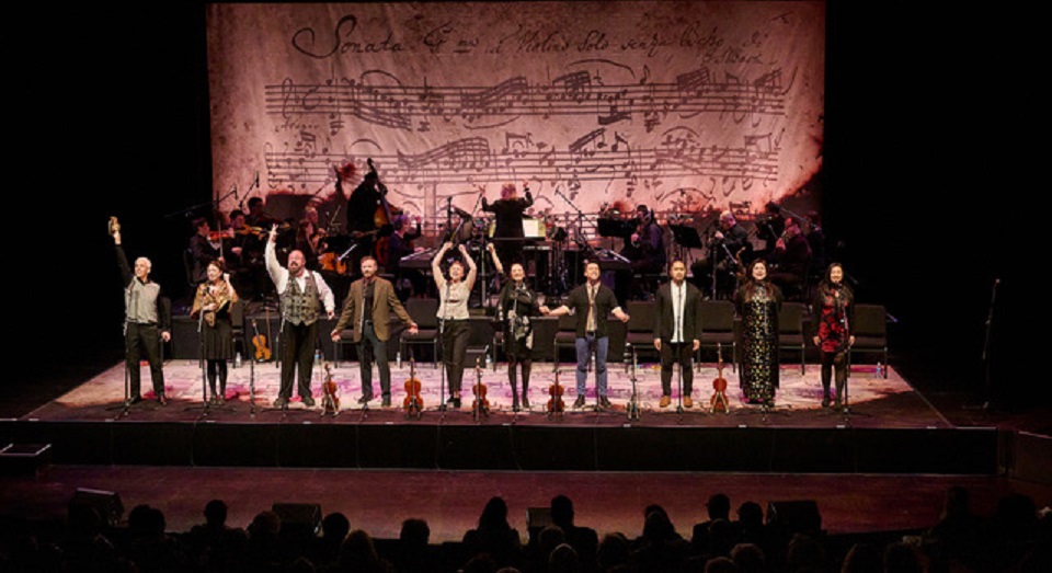Consistent with the norms of an American musical, Shanghai Sonatas has a variety of numbers, including a waltz, ragtime, cabaret, violin and erhu solos, ensembles, choruses. It’s a touching, important story, dramatically and musically well told. It’s important to take note of the final “s” in the show’s title. A sonata is generally understood as a particular compositional form common in Western music. But the word itself, deriving from Latin, means “sounded,” i.e., a musical piece that is played on instruments—as differentiated from “cantata,” which is sung. It is not just the Bach sonata, whose manuscript constituted the backdrop of the stage, that we hear, but also the Chinese music that “sounded” equally in the score, including some lyrics in Chinese. At one point, Lotte (Stephanie Lynne Mason), a Viennese character who’s not a trained singer, offers one of her beloved operetta numbers, and one of the Chinese singers outdoes her with a firm, confident high note.