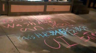 But apparently Schock’s office was offended and washed down the sidewalk. Determined to get their message across, Duzinskas and Keating re-chalked the sidewalks during the protest.