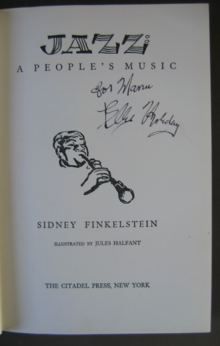 I wonder how famous Finkelstein was and is. His books exerted a pull beyond the Left, but certainly did not draw the attention they merited when he was alive. Jazz: A People’s Music is now 70 years old. It remains in a second printing with a marvelous preface by Professor Geoffrey Jacques of the University of California at Santa Barbara, who traces many of the jazz developments after 1948 and places Finkelstein in historical context. [The last edition is sold out, but a new edition is at the typesetters and preorders are being taken by International Publishers.]