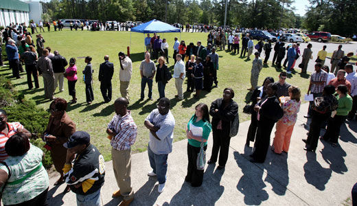Photo: Hundreds of job applicants stand in a snaking line in Hanahan, S.C. as they wait to get into a job fair. Alan Hawes/The Post and Courier/AP