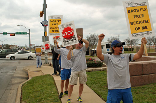 Photo: At the Love Field picket line, union members and supporters remind management it was union workers who helped build the company (PW/Jim Lane).
