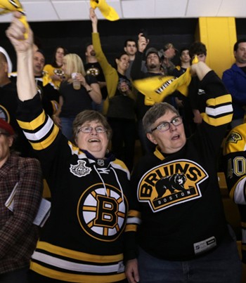 Photo: Marcia Hams, left, and Susan Shepherd cheer the Boston Bruins in Boston on Saturday. They were married on May 17, 2004. AP