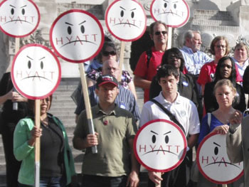 In one such event, we rallied at the Hyatt Regency in downtown Indianapolis, where hardworking hotel housekeepers are fighting to keep their jobs and boost their poverty-level pay at a hotel where rates can be more than $1,000 a night for a Super Bowl week room. Twenty longtime hotel workers may be out of jobs in a few days when the hotel ends a subcontract with Hospitality Staffing Solutions.