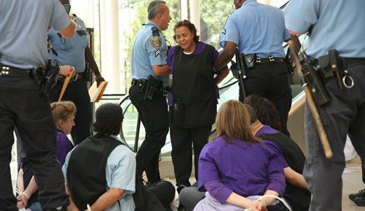 Photo: Janitors arrested in Houston for peaceful civil disobedience. Photo courtesy of SEIU Local 1.