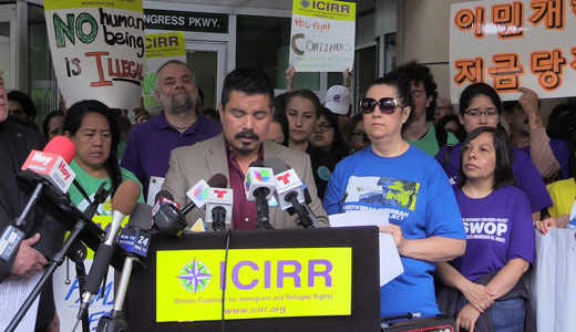 Photo: Illinois Coalition for Immigrant and Refugee Rights press conference in front of the Immigration control and enforcement detention center in Chicago, June 23. Earchiel Johnson | PW