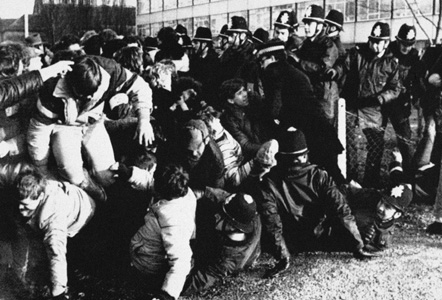 Photo: Police clash with striking miners picketing outside Britain’s National Coal Board’s area headquarters at Doncaster in South Yorkshire, March 27, 1984, as the strikers stepped up their efforts to bring working pits to a standstill. (AP Photo)