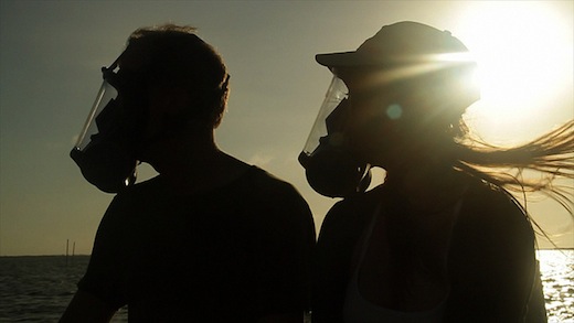 Photo: Josh and Rebecca Tickell, overwhelmed by fumes, don gas masks in “The Big Fix.” (The Big Fix Movie)