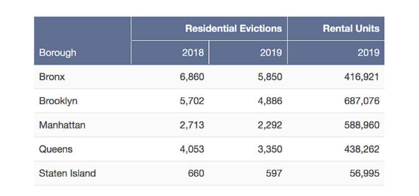 Although the number of 2018 and 2019 evictions in the Bronx were the highest, the number of rental units was the lowest. This shows that on average Bronx renters are far more likely to be at risk of being evicted from their homes. The percentage of evictions is out of proportion to the number of rental units. This corresponds with higher rates of unemployment during the pandemic. The Bronx reached an almost 25% unemployment rate during the pandemic. The combination of high unemployment, dilapidated living conditions, lack of care for medical professionals, high eviction rates, and a history of environmental racism all coalesce into a disastrous situation for working-class people in the Bronx.