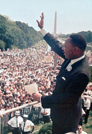 Photo: Dr. Martin Luther King Jr. acknowledges the crowd at the Lincoln Memorial for his “I Have a Dream” speech during the March on Washington, Aug. 28, 1963. AP