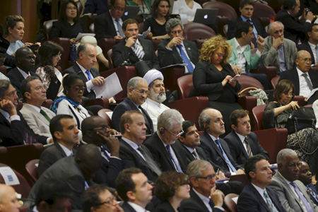 Photo: Mayors gather in the Synod Hall to attend a conference on Modern Slavery and Climate Change at the Vatican, July 21. Dozens of environmentally friendly mayors from around the world met with eco-Pope Francis and committed to reducing global warming and helping the urban poor deal with its effects. (AP Photo/Gregorio Borgia)
