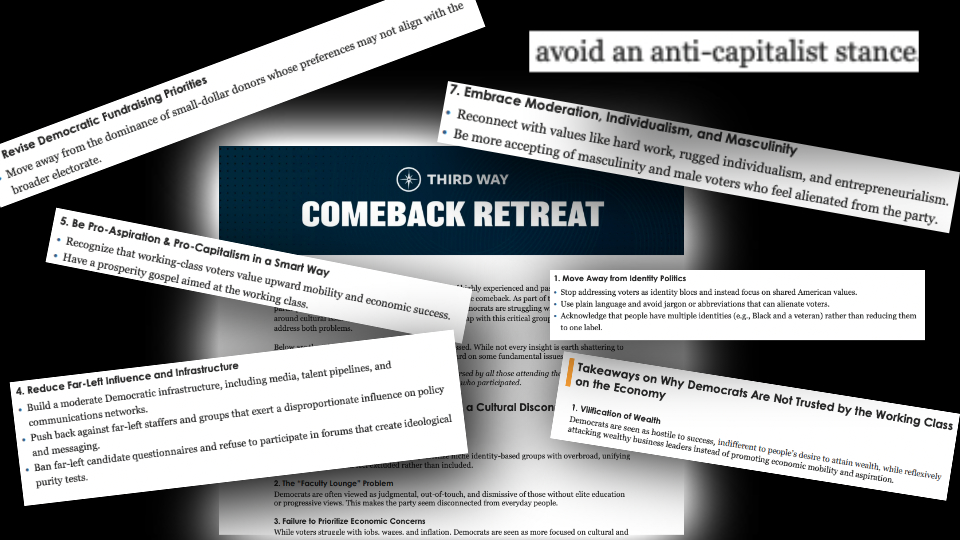 Earlier this month, Politico reported that in February a group of Democratic “consultants, campaign staffers, elected officials, and party leaders” had convened in Virginia to chart a course forward for the party. The so-called “Comeback Retreat” was organized by the corporate centrist think tank Third Way and resulted in a summary document highlighting some of the top takeaways from the convening. In a series of bullet points, the authors of the document summarize the ways that, in their view, Democrats can reconnect with working class voters.