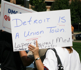 Hundreds of registered nurses were joined by autoworkers from the UAW’s Region 20 as they rallied in front of the Detroit Medical Center Oct. 4 to protest unfair labor tactics by the hospital.