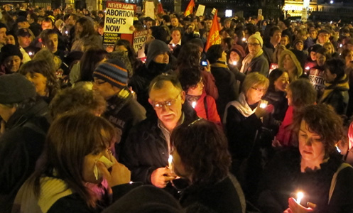 Photo: Protesters light candles in memory of Savita Halappanavar during a rally outside Ireland’s government headquarters in Dublin, Nov. 17. Thousands marched to the spot to demand that the government draft a law defining when abortions can be performed to save a woman’s life. Shawn Pogatchnik/AP