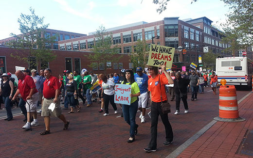 COLUMBUS – In a powerful rebuff to extremist efforts to push “Right-To-Work” and other anti-working class programs, some 4000 union members and supporters poured into Columbus Friday, Aug. 21 to protest the “Summit on the American Dream” held by Americans for Prosperity” (AFP), a political action group funded by the right-wing billionaire brothers, Charles and David Koch.
