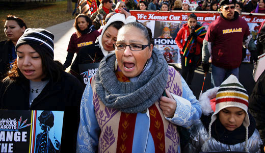Photo: Dorene Day, an Ojibwe, sings the American Indian Movement song during a march with a coalition of tribal nations, Native American organizers, and the University of Minnesota to support retiring the Washington NFL team name and mascot, outside the TCF Bank Stadium in Minneapolis Nov. 2, before the Vikings face the R******s in a football game. Opponents of the name say it’s a slur that mocks Native American culture and they want the team to change it. (Leila Navidi /The Star Tribune/AP)