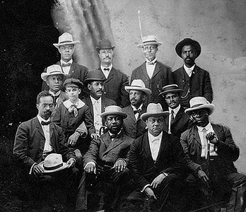 Photo: 1905 Niagara movement: meeting. Top row (left to right): H. A. Thompson, Alonzo F. Herndon, John Hope, James R. L. Diggs (?). Second row (left to right): Frederick McGhee, Norris B. Herndon (boy), J. Max Barber, W. E. B. Du Bois, Robert Bonner. Bottom row (left to right): Henry L. Bailey, Clement G. Morgan, W. H. H. Hart, B. S. Smith. Wikimedia Commons.