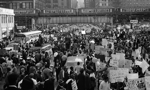 Photo: Crowd fills LaSalle Street between City Hall and building housing Board of Education as thousands of demonstrators marched in Chicago on Oct. 22, 1963, protesting school segregation. Paul Cannon/AP