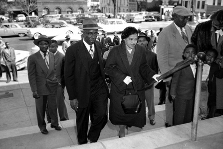 Photo: Rosa Parks with by E.D. Nixon, of the Alabama NAACP, on arrival at the courthouse in Montgomery, March 19, 1956, for the bus boycott trial. Mrs. Parks was fined $14 on Dec. 5 for failing to give up her seat for a white passenger on a city bus. The bus boycott started on the day she was fined. There were 91 other defendants. Gene Herrick/AP