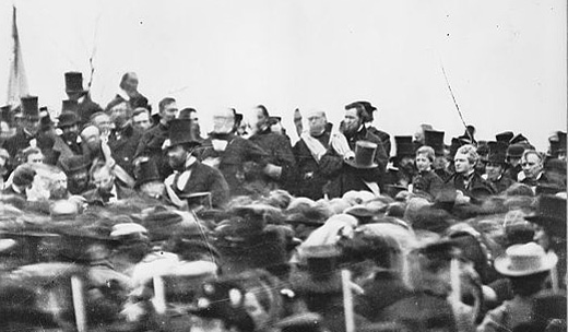 Photo: The only known photograph of President Lincoln giving his Gettysburg speech, taken by photographer David Bachrach. Lincoln is seated on the right at the end of the dais, facing the crowd. Wikimedia Commons: This image is in the public domain because its copyright has expired.