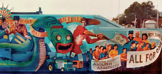 In the midst of the fray, a P-9 leader, Denny Mealy, and muralist Mike Alewitz led the workers in painting an exuberant mural on their union hall which came to symbolize the strike. The union dedicated the mural to then-imprisoned Nelson Mandela, at a time when he was still being vilified as a terrorist by Reagan’s government.